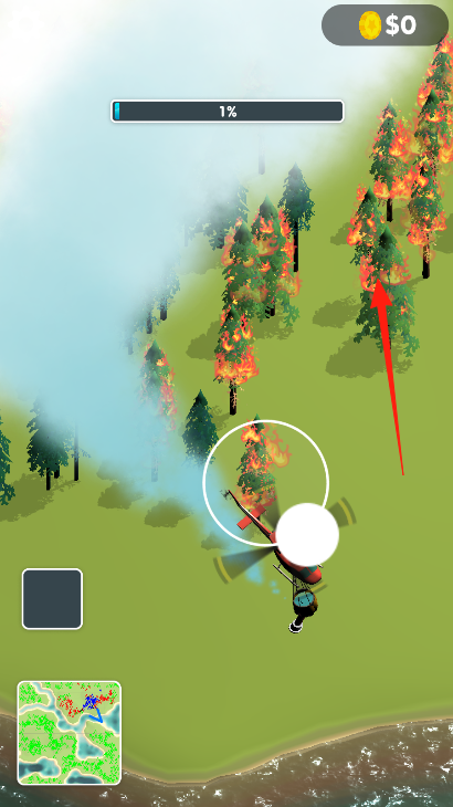 1、进入游戏操控红色直升机,可以根据左下角的地图飞向森林火灾区域(箭头指向着火点),准备灭火。