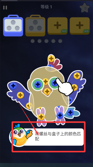 1、玩家需要仔细观察关卡初始布局,识别可移动的螺丝钉并将其拖拽到对应颜色的盒子中完成消除,操作简单但需要策略思考。