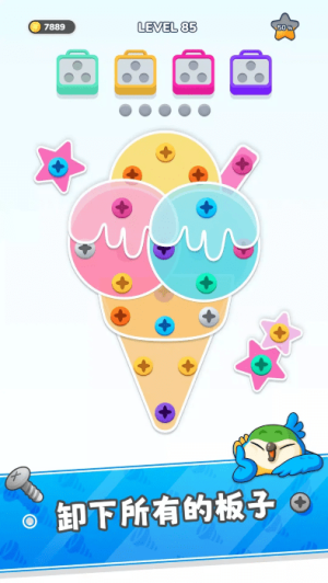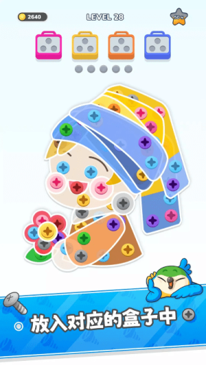 1、游戏独创性地将螺丝钉匹配机制与消除玩法相结合,玩家需要精准识别相同颜色的螺丝并将其放入对应颜色的盒子中,这种新颖的交互方式为传统解谜游戏注入了新鲜活力。