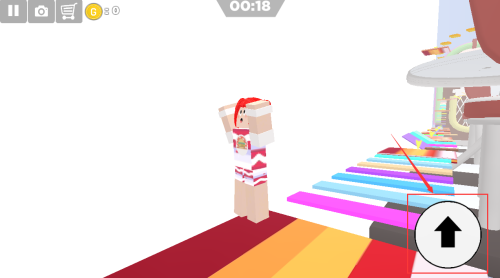 4、点击白色箭头,让角色跳跃彩色琴键道路。
