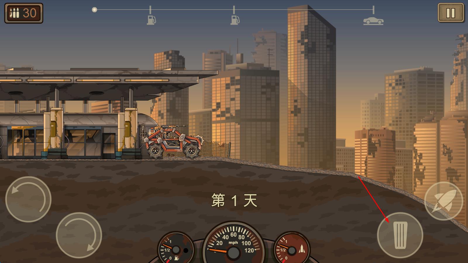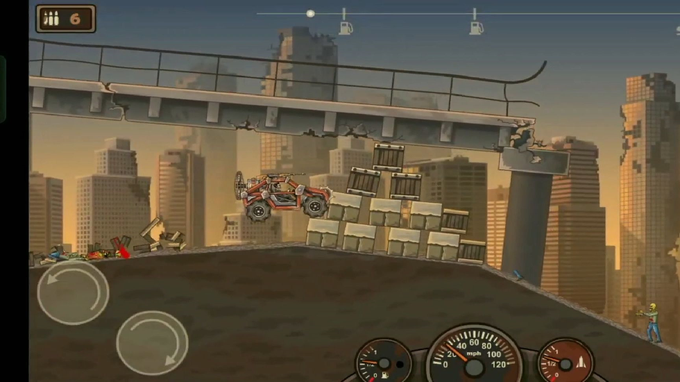 2、游戏中左侧按钮控制车辆压头和抬头,右侧是油门,火箭按钮使用推进器,驾驶时需在城市场景中穿越障碍,冲撞僵尸,注意车辆耐久避免被撞毁。