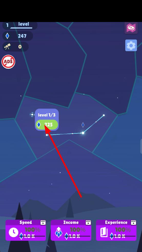 2、持续探索星图,遇到标有“level1/3”等节点,查看升级需要多少钻石,完成连接升级,利用下方Speed、Income、Experience加成,提升连线效率。