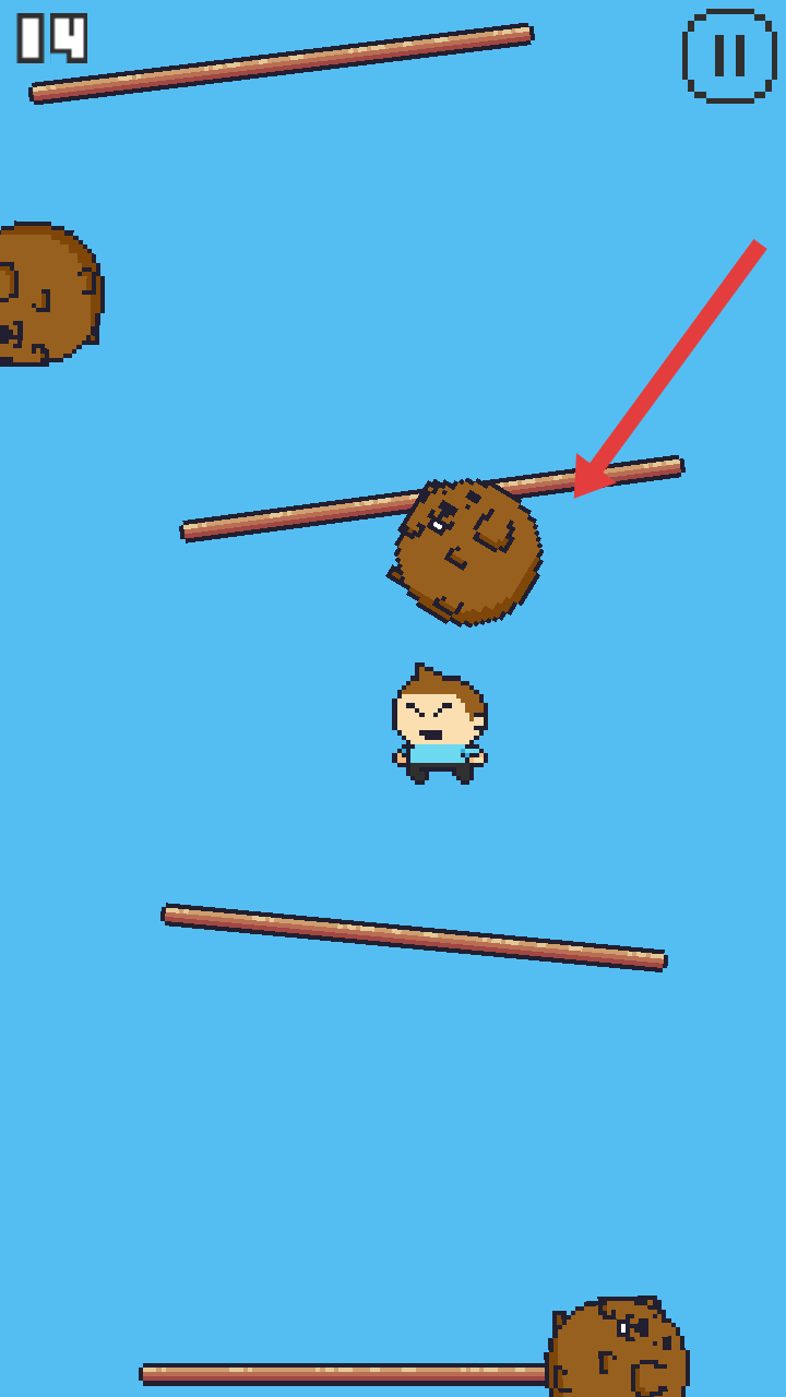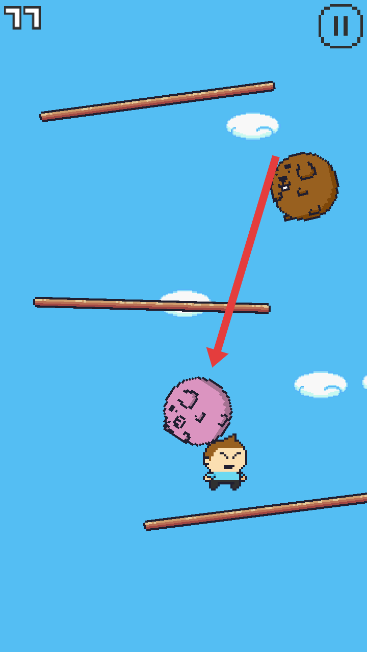 2、在帮助角色向上跳跃的路程中,会遇到很多棕色圆球敌人,可以选择避开他们或者把他们顶开。