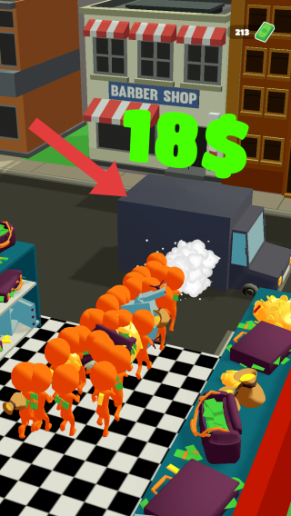 3、画面中有一群橙色小人角色,上方有写着BARBERSHOP的理发店建筑,绿色的18$字样代表收益,店铺内部的黑白格子地板区域等元素。