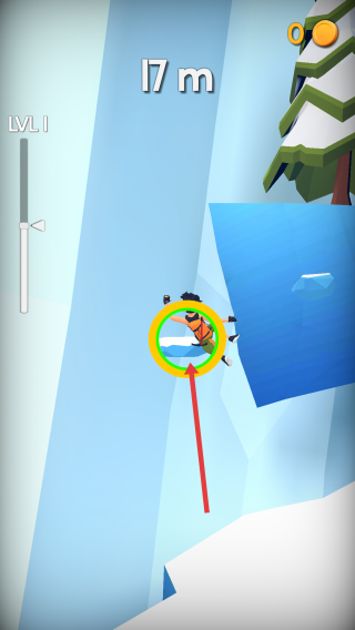2、游戏中观察角色周围圆环提示,点击屏幕让角色跳跃抓握冰面凸起,持续向上攀爬。