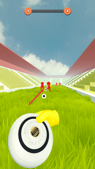 1、在“Level1”关卡,长按屏幕“Hold to Aim”瞄准,调整飞盘投掷角度与力度,避开红色小人障碍。