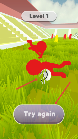 2、松开手指投掷飞盘,让飞盘越过或绕过阻拦,飞向黄色目标点,若被红色小人拦截则失败,点击“Try again”重新挑战。