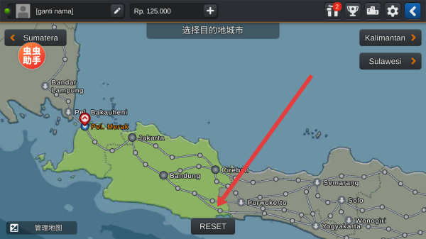 2、在选择目的地城市地图,若需重置路线,可以点击RESET,重新规划巴士行驶的目的地。