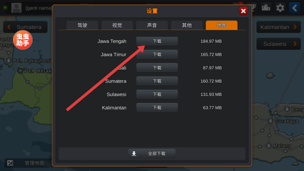 3、进入设置地图页,通过点击Jawa-Tengah旁下载,获取该地区地图数据,拓展巴士行驶区域。