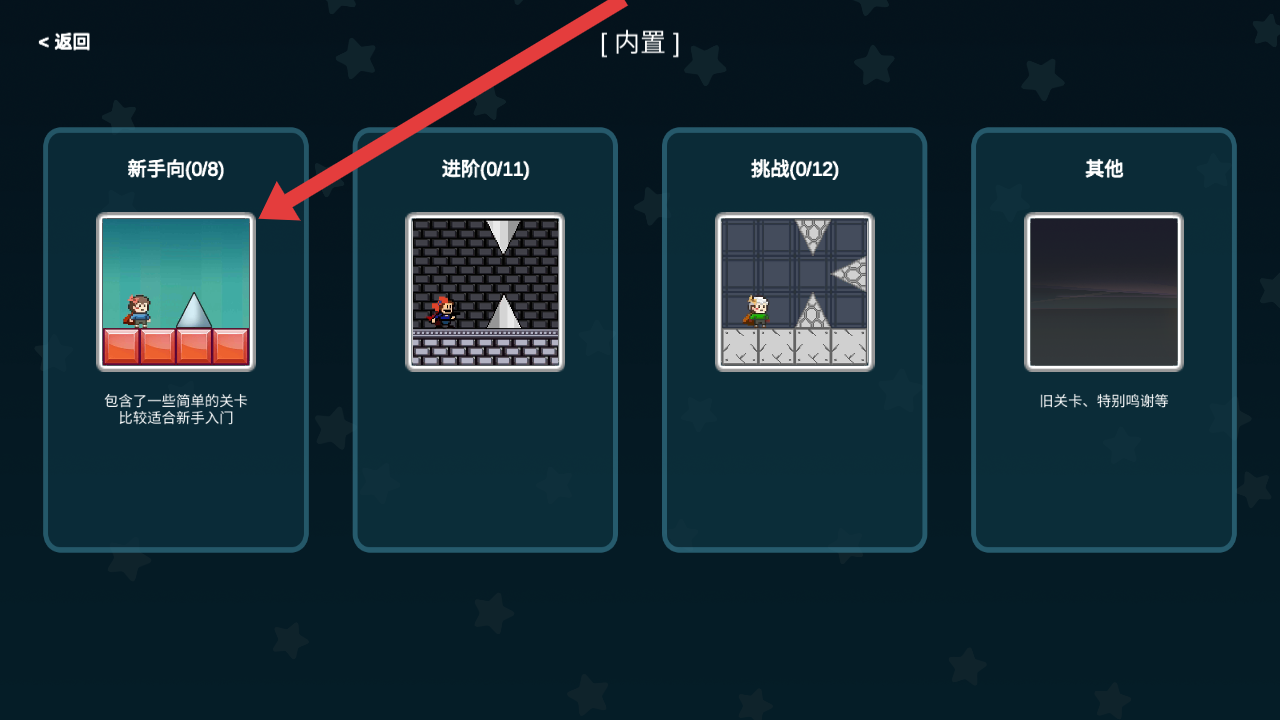 1、进入关卡选择界面,点击新手向板块内含简单的关卡,开启适合新手的入门冒险,熟悉基础操作。