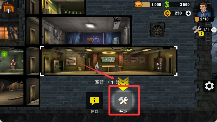 3、然后指挥工人,再点击下方按键升级我们的军营。