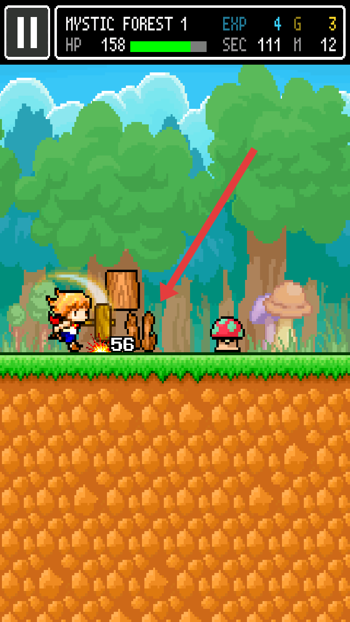 2、在MYSTIC FOREST1的游戏关卡,需要点击操控角色攻击箭头指向的蘑菇怪物,积累经验与金币。