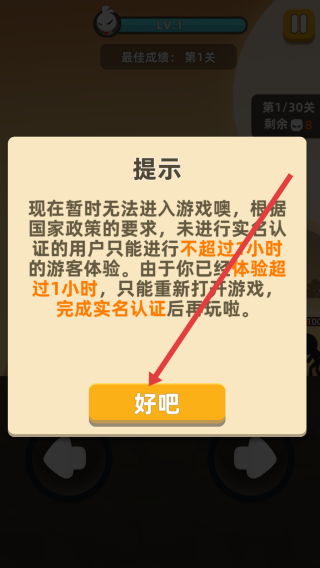 3、进入到游戏中收到体验超时提示,点击好吧,重新打开游戏完成实名认证,即可继续游玩。