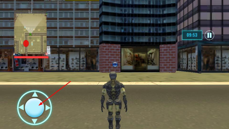 3、玩家在操作角色时通过左下角虚拟摇杆控制移动方向,在城市场景中探索、战斗,完成游戏任务。
