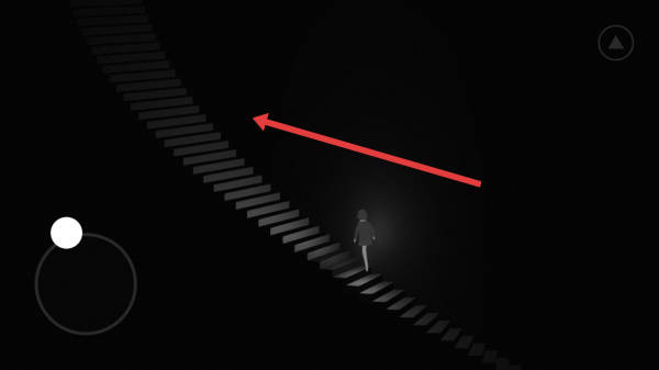 3、需要按照沿箭头方向,让角色走上阶梯,深入探索场景,在黑暗环境中开启新的冒险阶段。