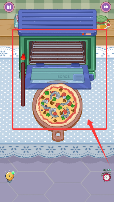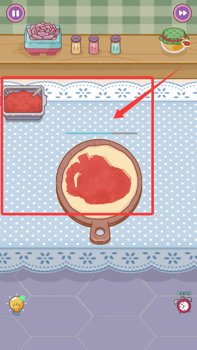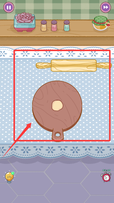 1、进入厨房场景,在案板用擀面杖将面团擀成合适形状,为制作披萨备料。