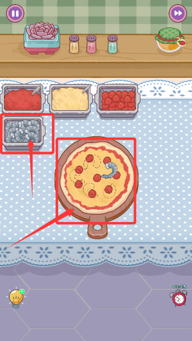 3、从食材区选所需配料,如虾仁等,放置到涂好酱的面饼对应位置。