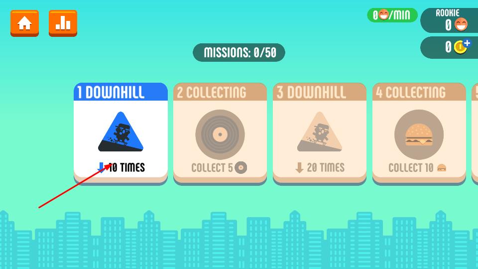 1、在任务界面,选择1 DOWNHILL等关卡,点击进入,按要求完成次数10次downhill开启滑板挑战。