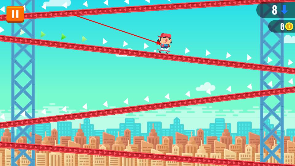 2、进入游戏场景,操控滑板角色在红色轨道滑行,躲避障碍,沿着轨道向下,保持滑行状态。