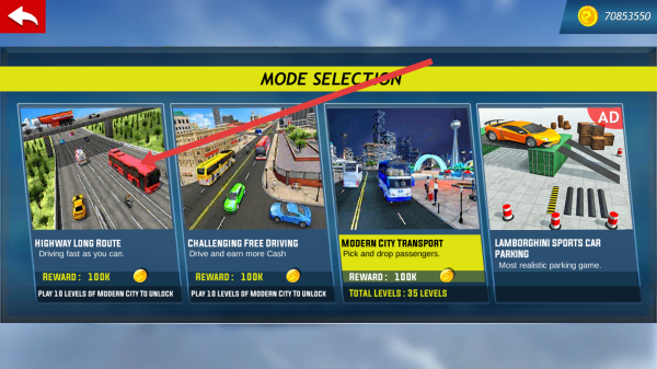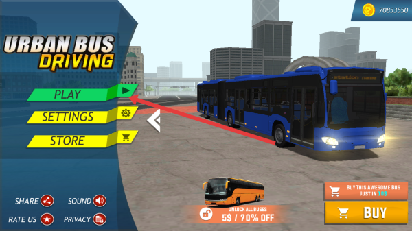 1、进入到游戏里,在Urban-Bus-Driving主界面,点击PLAY,进入模式选择,开启巴士驾驶挑战。