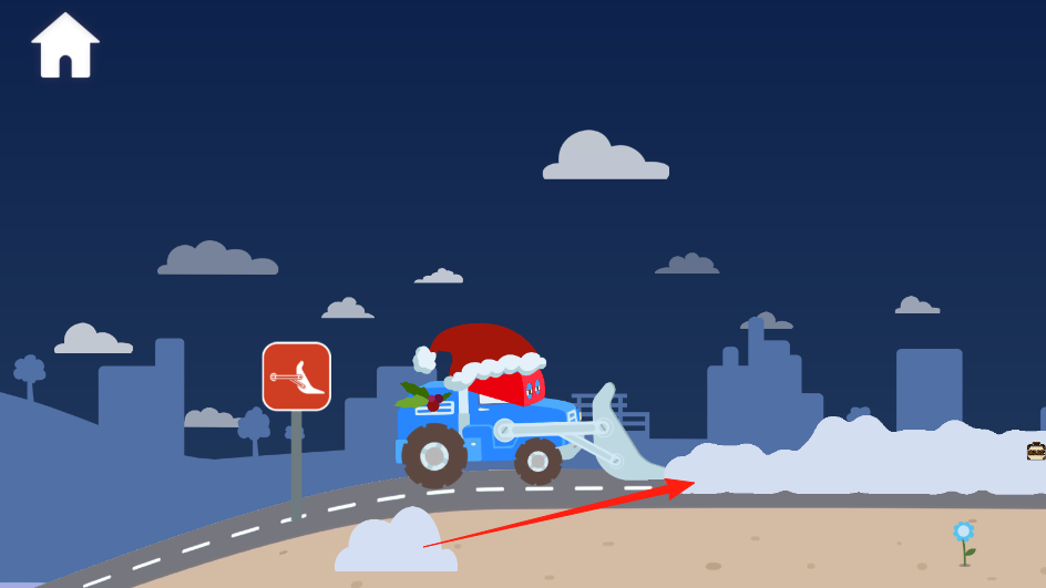 3、操控戴圣诞帽的卡车箭头指向,沿道路行驶,清理积雪或完成关卡任务抵达终点。