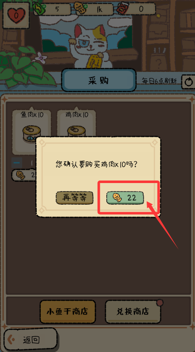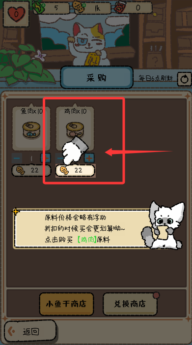 1、每日商店自动更新,可购入鱼肉与鸡肉原料,价格会随机波动。