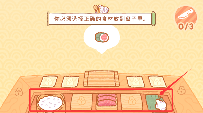 2、依据提示,从下方食材区选对应食材,放置到盘子指定位置。