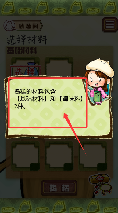 1、进入烧烤间,查看提示,明确捣糕需基础材料和调味料各一种。