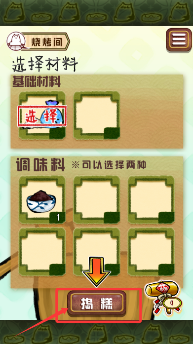 2、在材料选择页,选基础材料与两种调味料,点击“捣糕”制作。