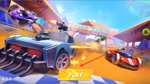 1、主界面点击黄色PLAY,进入赛车选择,驾驶带武器的赛车,参与OVER LEAGUE赛事,开启竞速对决。