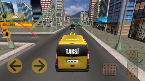 2、选PRACTICE MODE,进入城市街道,操控黄色TAKSİ出租车,用左右箭头控方向,留意COLLISION计时。