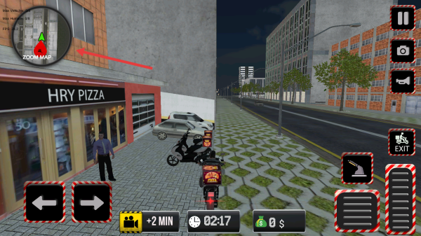 2、在街道场景,依据小地图和箭头指引,驾驶摩托前往HRY PIZZA店铺,留意时间和路人,安全行驶。