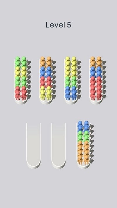 3、清爽画面风格:采用简洁清爽的画面设计,试管和小人颜色鲜明,界面无多余干扰元素,让玩家能清晰观察颜色分布和排序进度,专注排序过程。
