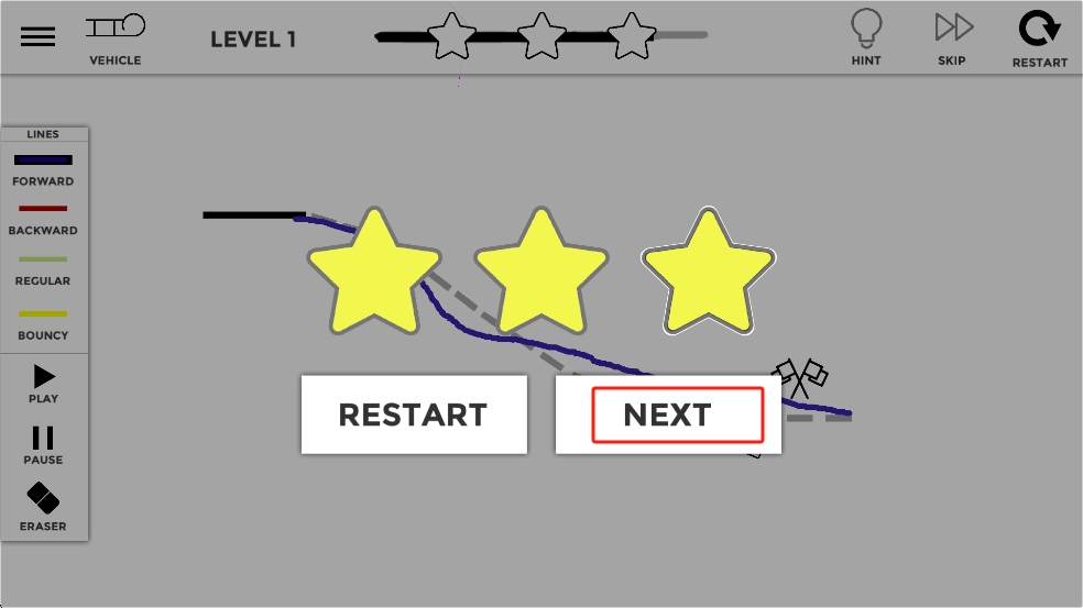 3、关卡结束界面,若已收集星星达成条件,点击NEXT按钮即可进入下一关,要是想重玩优化路线也可以点RESTART按钮。