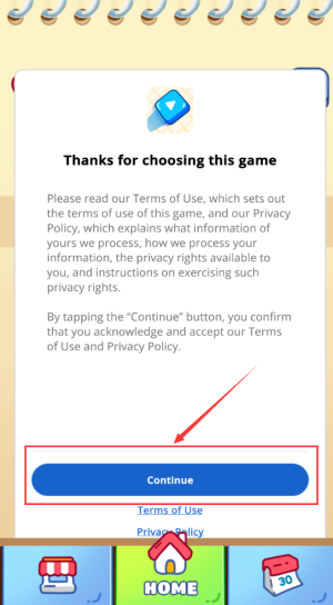1、点击蓝色继续按钮,确认同意条款开始游戏。