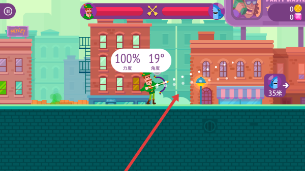 3、战斗时可以滑动屏幕调整力度100%、角度19°,发射弓箭,精准打击对手击败他取得胜利。