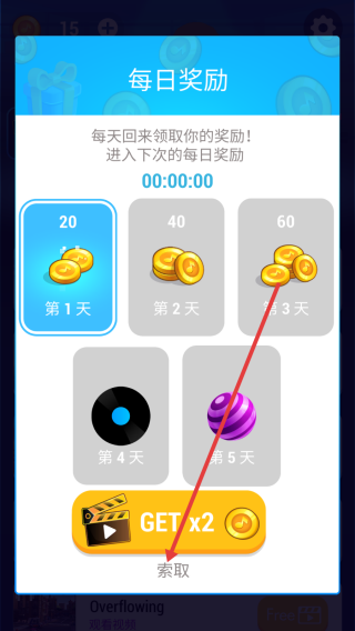 1、进入每日奖励页,点击索取,领取第1天20金币,或看广告双倍获取,积累游戏资源。