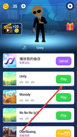 2、在曲目选择界面,选择Unity点击旁边Play按钮,选定音乐,进入跑酷模式,跟随节奏挑战。