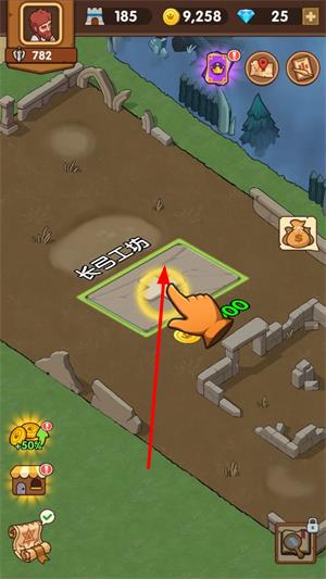 1、进入游戏,点击空白地面的+号修建首个武器工坊,初步打造基础武器,再点击村庄钟楼招募小兵,为抵御野怪做好准备。