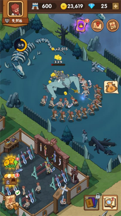 2、游戏中途,用击败野怪获得的金币升级工坊,解锁更多武器制作,招募不同职业兵种,应对从各地出现的多样敌人,逐步扩大防御力量。
