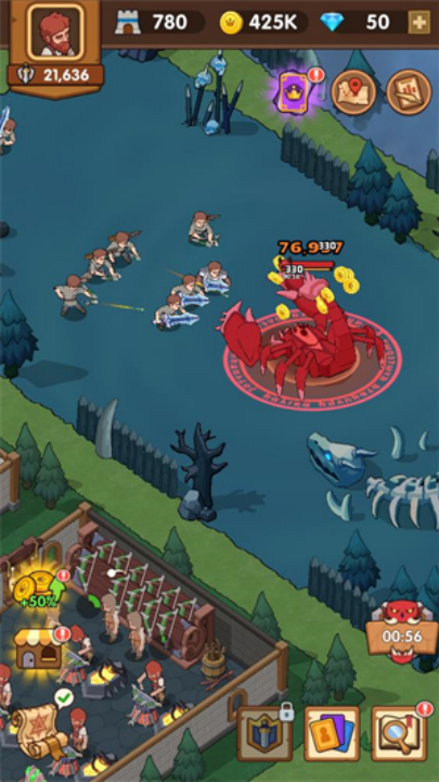 3、当成功击败boss解锁新工坊区域,继续建造、升级与招募,让村庄愈发坚固,战士愈发强大,最终收复所有失地,完成保卫使命。
