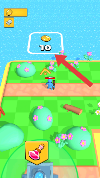 1、草地、花朵、树木、水域,左上角有金币显示,下方有道具粉色瓶子,呈现玩家需采集金币的任务指引。