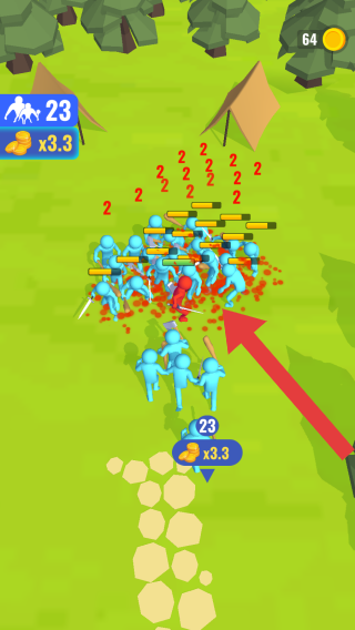 2、小人战斗操作:操控角色对不同颜色小人发起攻击,通过点击或滑动屏幕完成了攻击的动作,消灭了所有的敌人获胜。