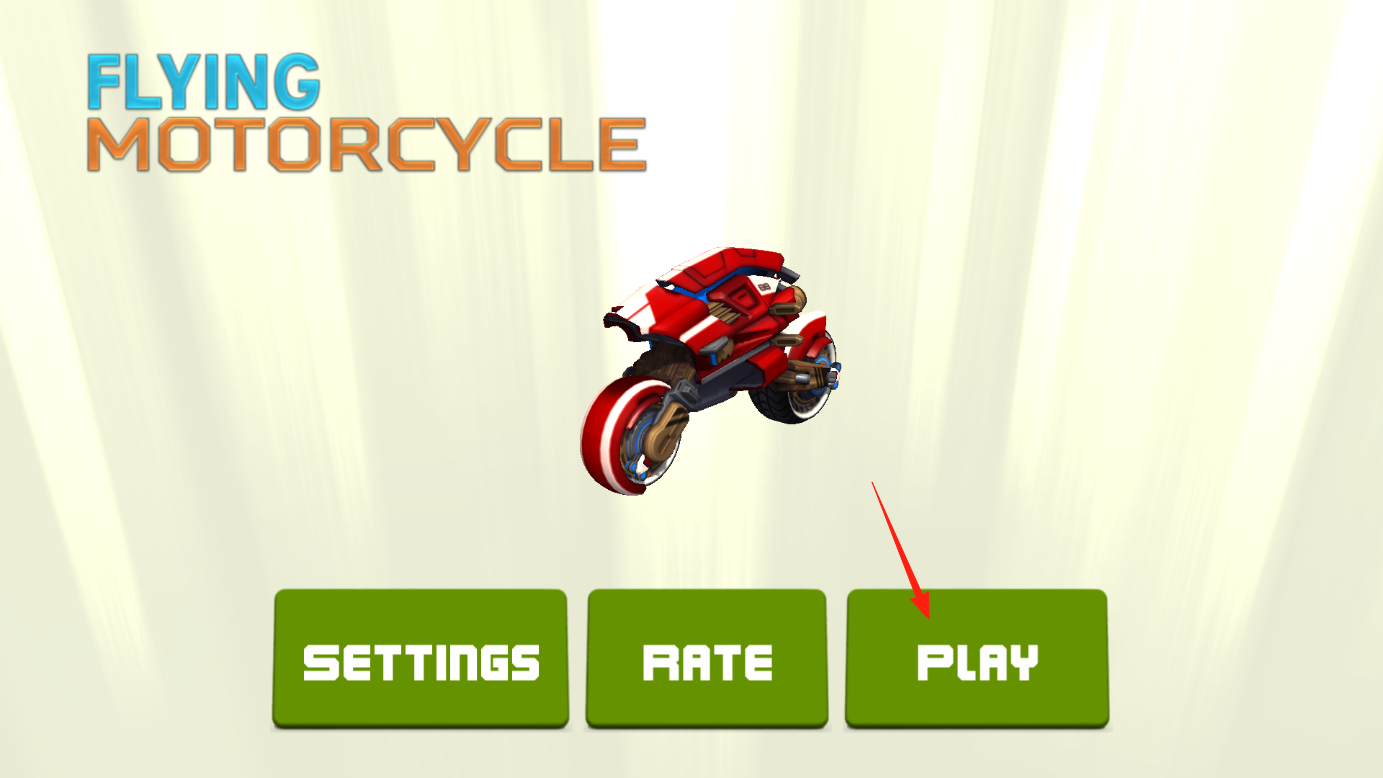 1、看到FLYING MOTORCYCLE界面,点PLAY进入游戏,能操控会飞的摩托,想象自己骑上它,一会儿低空贴地飙车一会儿腾空飞跃,开启炫酷又刺激的飞行摩托冒险。
