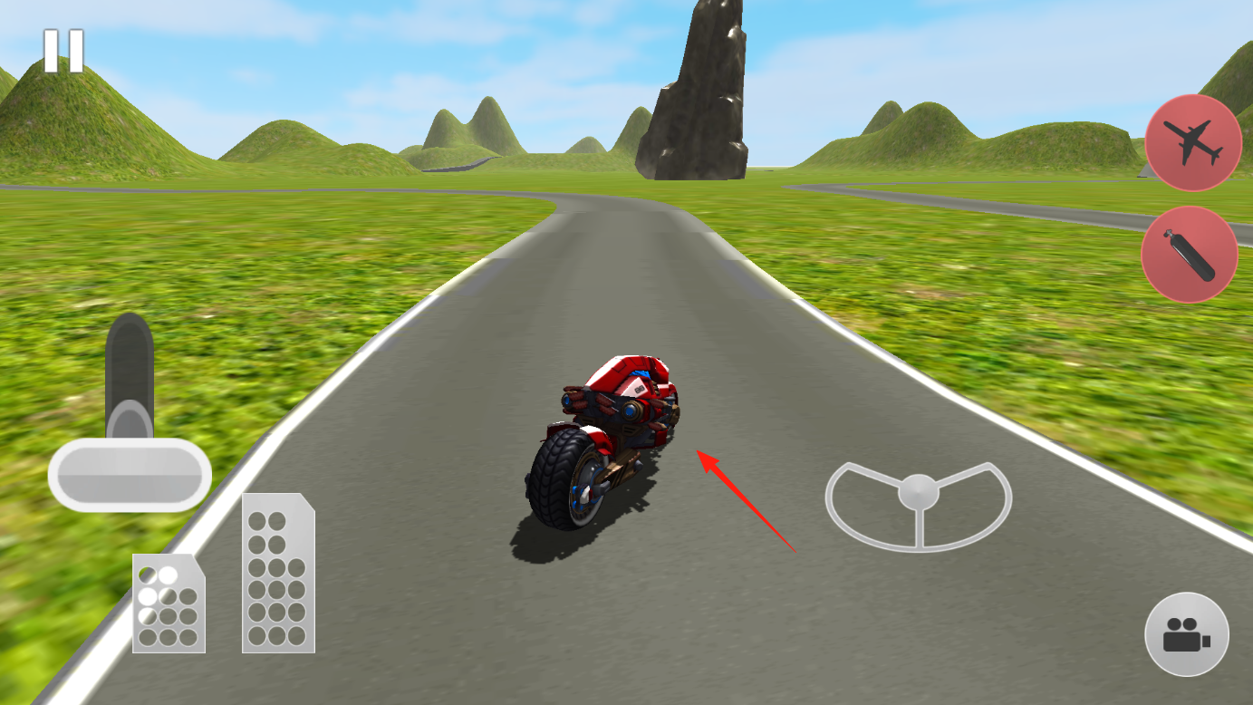 3、在FREE FLY模式里,操控摩托在公路、草地穿梭,用虚拟摇杆控制方向,按住加速键飙起来,,感受从地面到空中的切换,还能试试空中翻转、急停急飞,把飞行摩托玩出花。