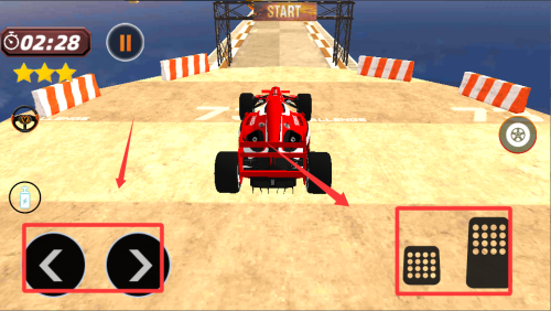 1、进入游戏后先选择初级赛道熟悉操作,利用虚拟按键控制赛车加速与跳跃。