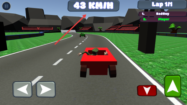 2、选第1关,驾驶红色赛车,在弯道赛道与Badguy竞速,用左右箭头控方向,关注时速。