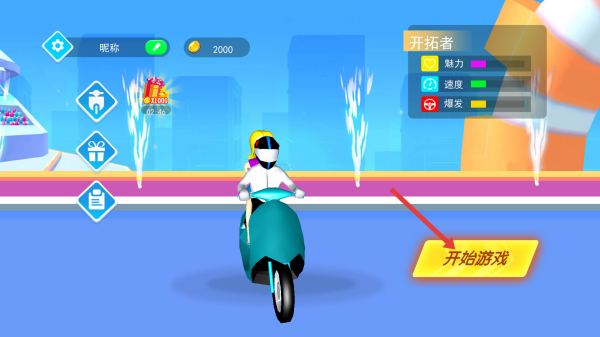 1、点击开始游戏,选用开拓者摩托,进入赛道,用油门键加速,左右按键控方向。