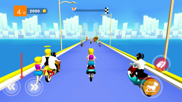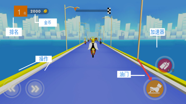 2、比赛中留意排名、金币,拾取加速器道具,超越对手,在桥梁赛道争取领先。