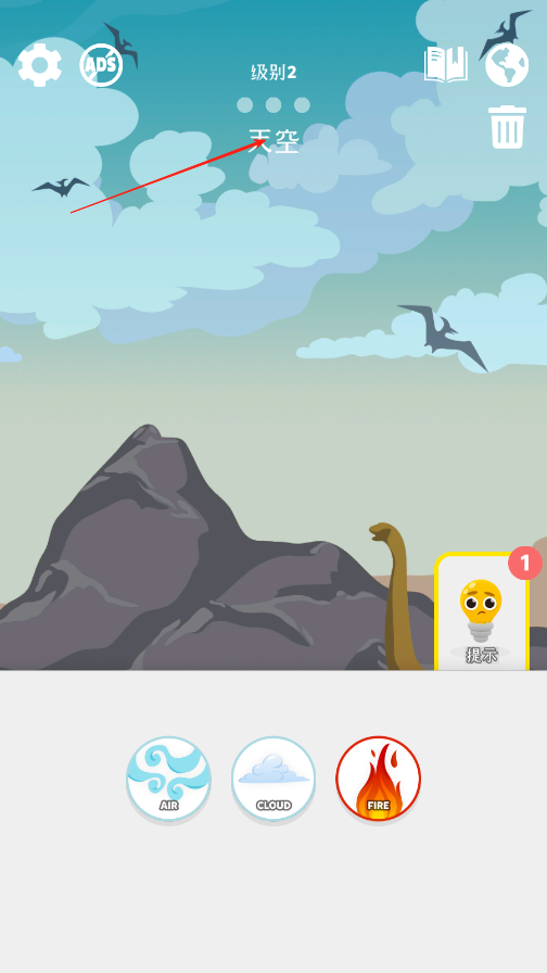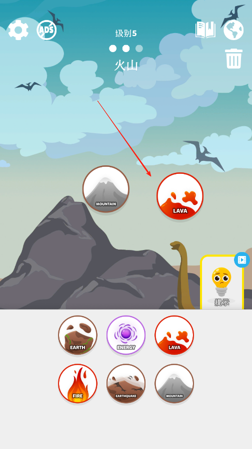 3、右下角有提示,如果合成不出新元素,就点击右下方的提示,只要将山河火两个元素合在一起,就是火山。
